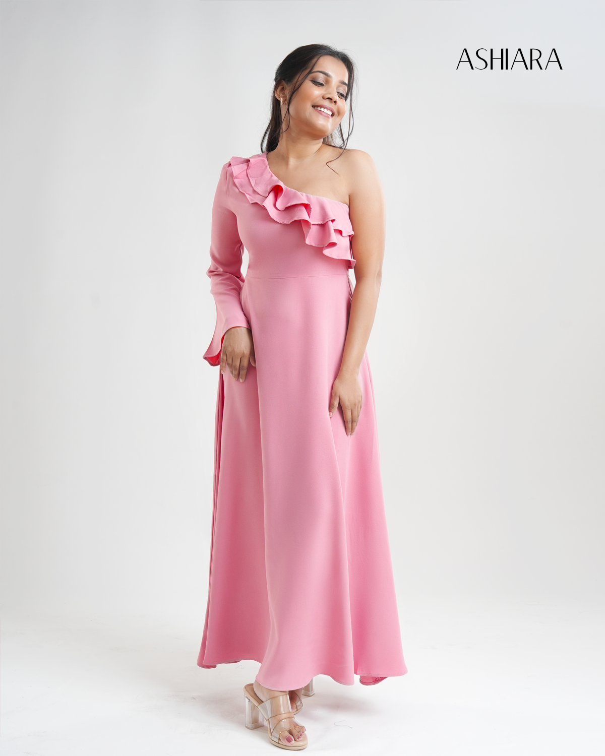 The Athena Maxi Dress in soft peach features an elegant one-shoulder design with cascading ruffles. Made from lightweight mosh crepe, it flows gracefully for a flattering, princess-cut silhouette—perfect for special occasions and memorable evenings.