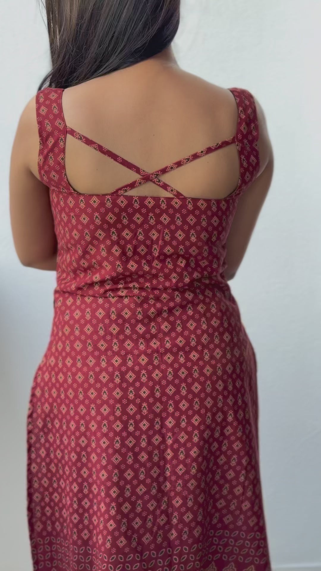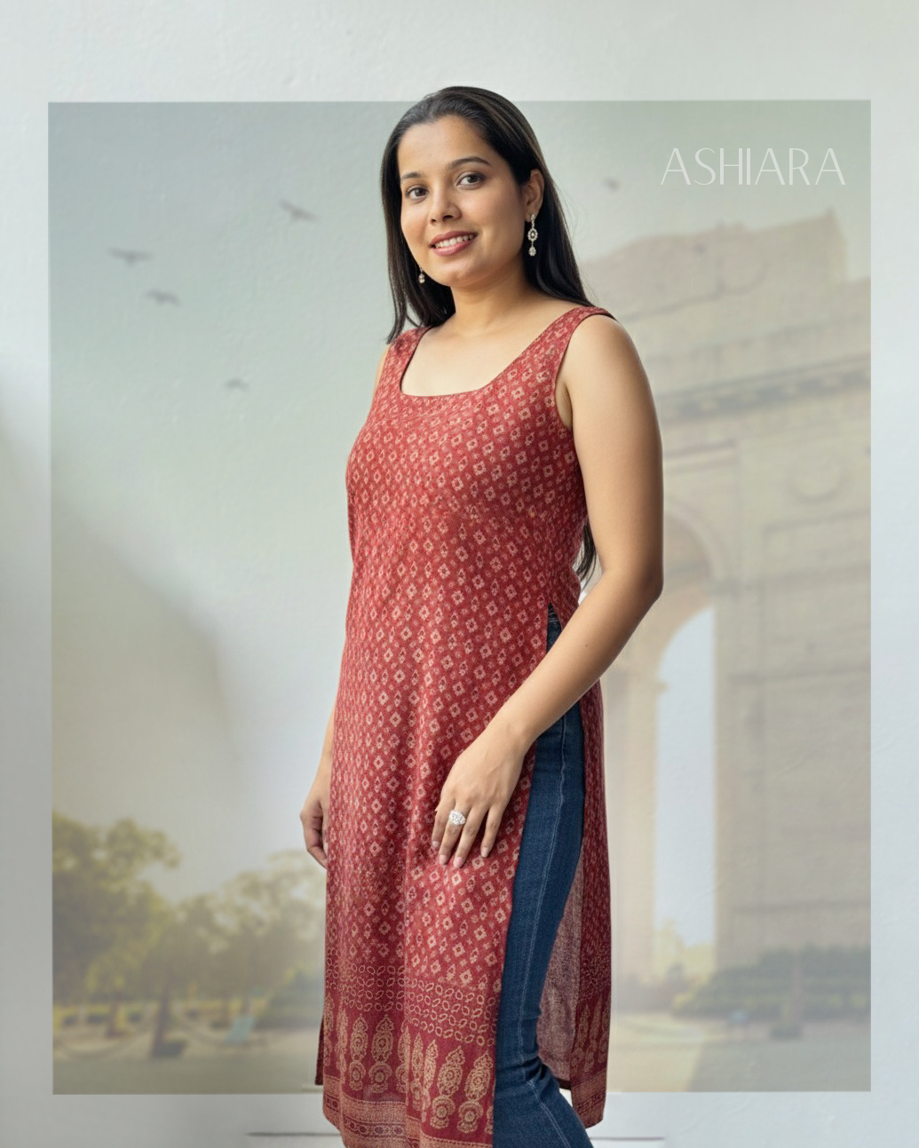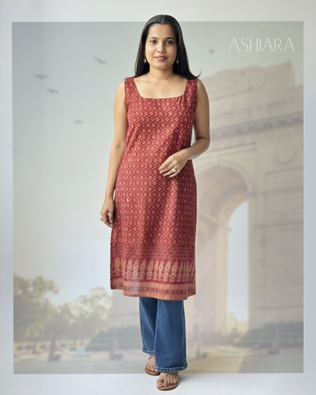 The Kiara Kurti -Motif combines elegance with comfort through its delicate motif patterned border and sleeveless design.