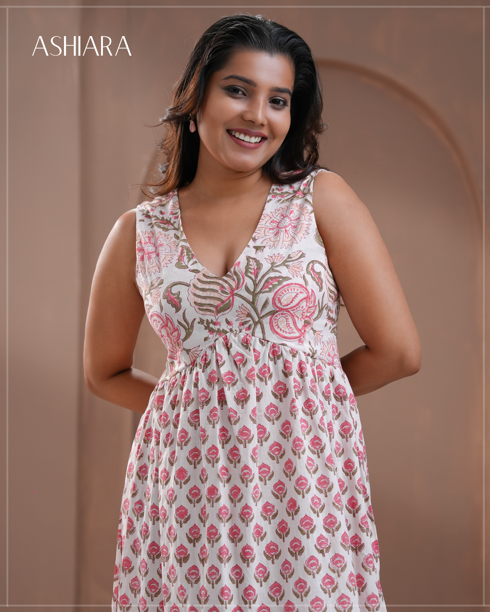 Made from 100% Indian block-printed cotton, this sleeveless dress features a flattering V-neck, empire waist, and flowing tiered skirt. Lightweight and breathable, it’s perfect for sunlit brunches or garden gatherings.