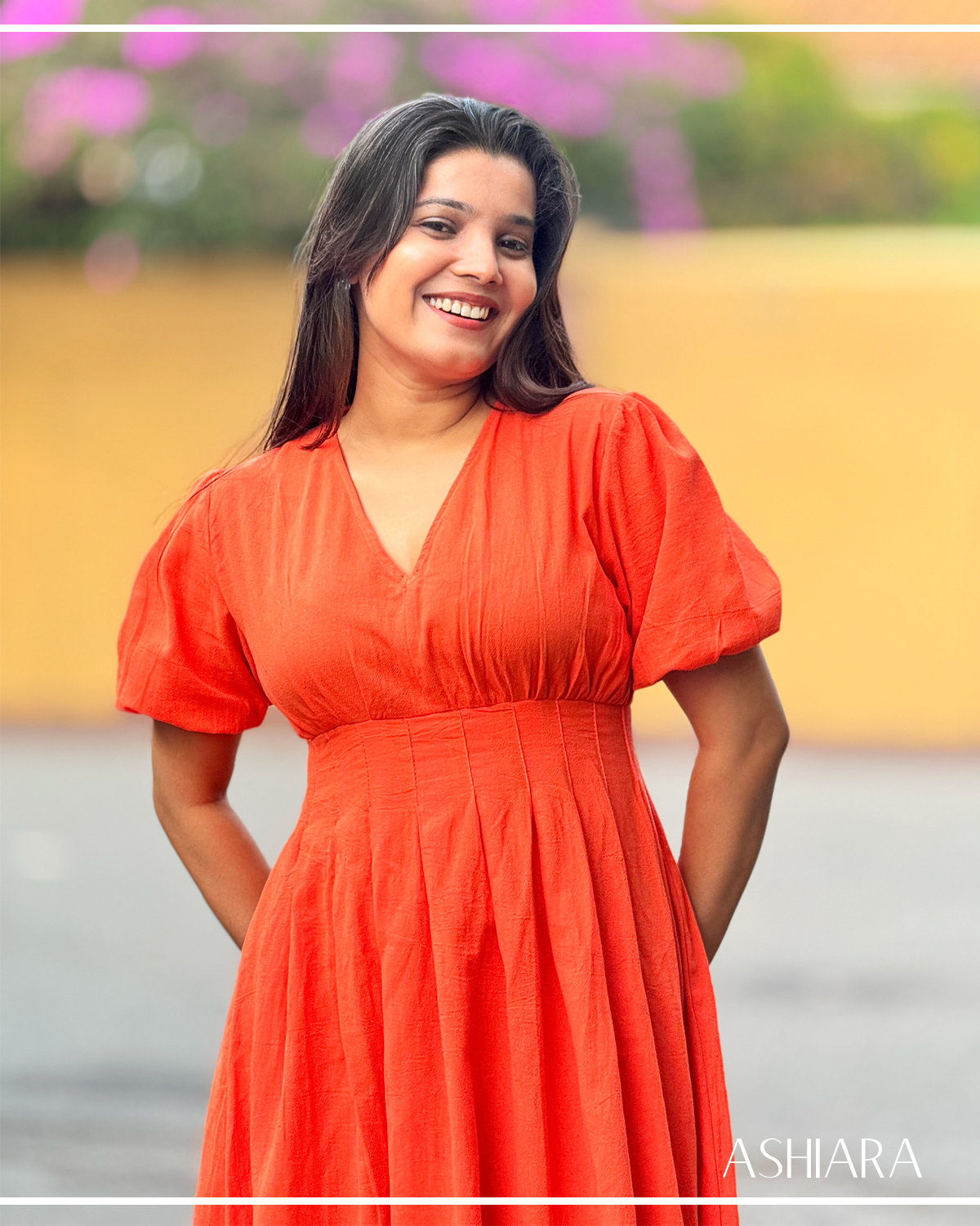 Laura Midi Dress-This midi dress features a flattering V-neckline, cinched waist, and romantic puff sleeves that balance structure with softness. Deep pleats add movement and dimension to the skirt, while the rich Orange colour works with everything in your closet. Back zipper for easy on-and-off. Your new go-to for styled simplicity.