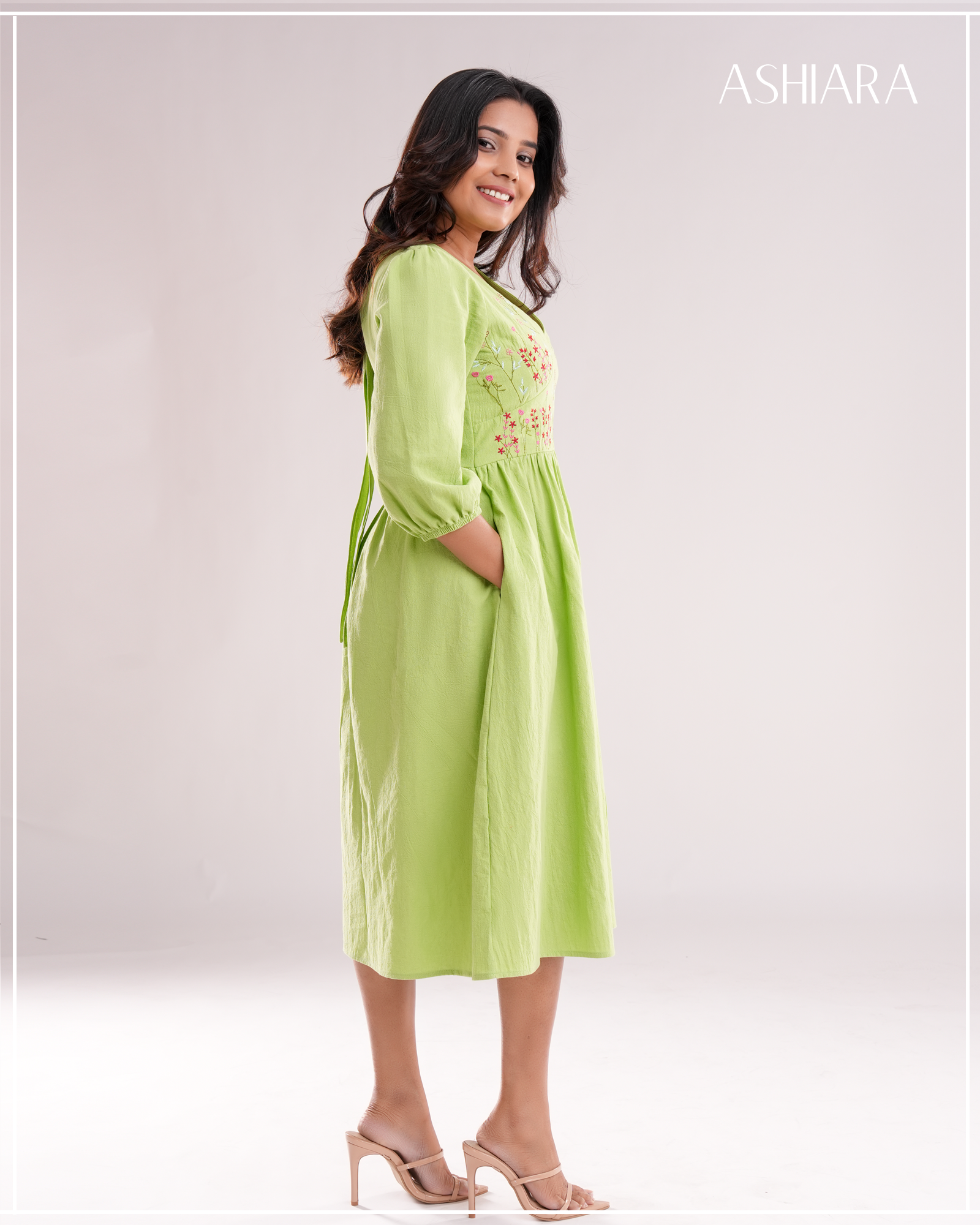 Le'lusia Pastel green midi-length dress - a graceful blend of style and artistry. Crafted in a soft, flowy silhouette, this dress features a thoughtfully designed yoke cut for a structured yet comfortable fit. The fabric tie-up at the back ensure ease of wear, while the delicate botanical embroidery on the yoke and waist adds an intricate charm.