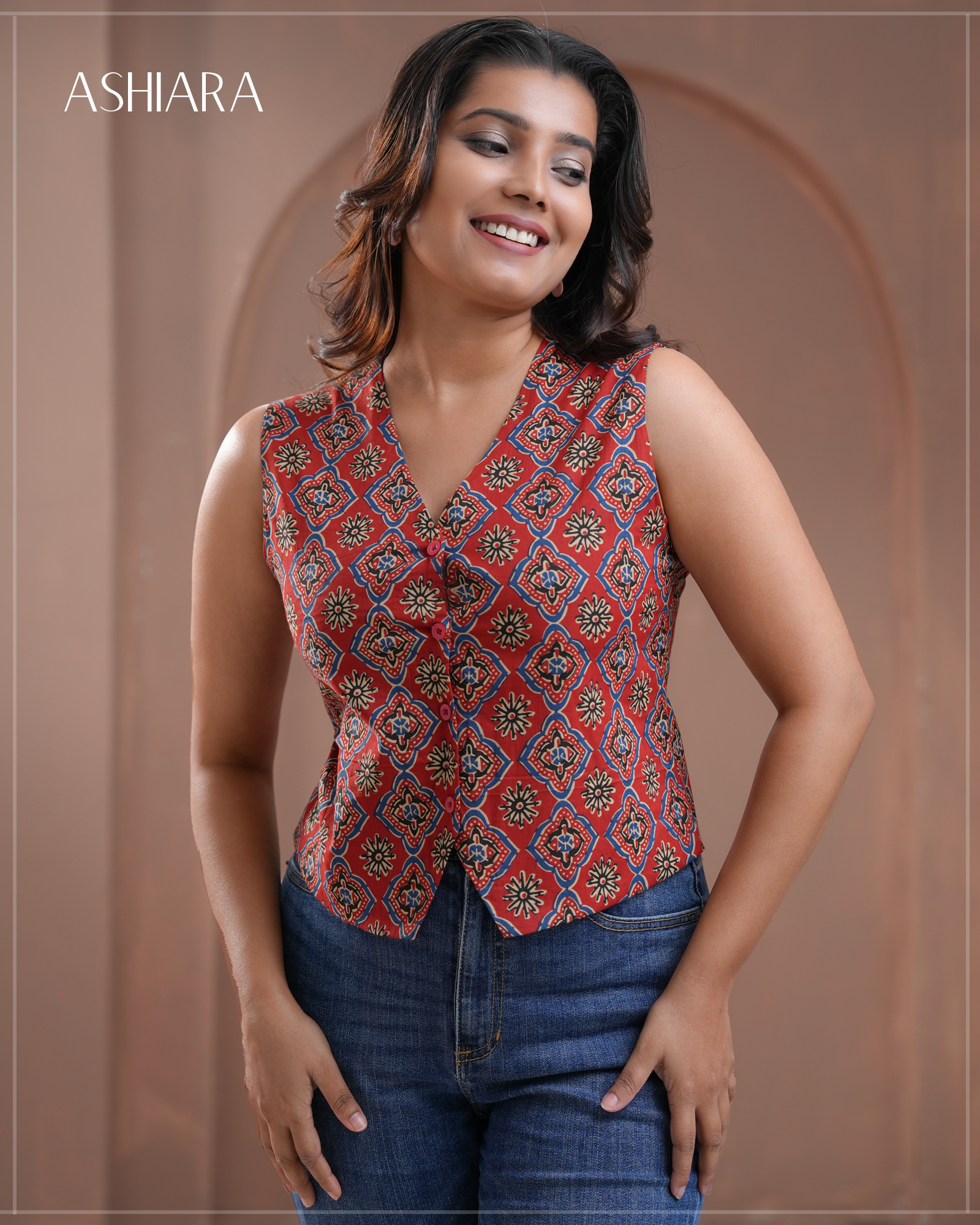Rendered in deep maroon with ivory hand-blocked "Buta" motifs, this 100% sustainable cotton piece is fully lined for a smooth, comfortable fit.