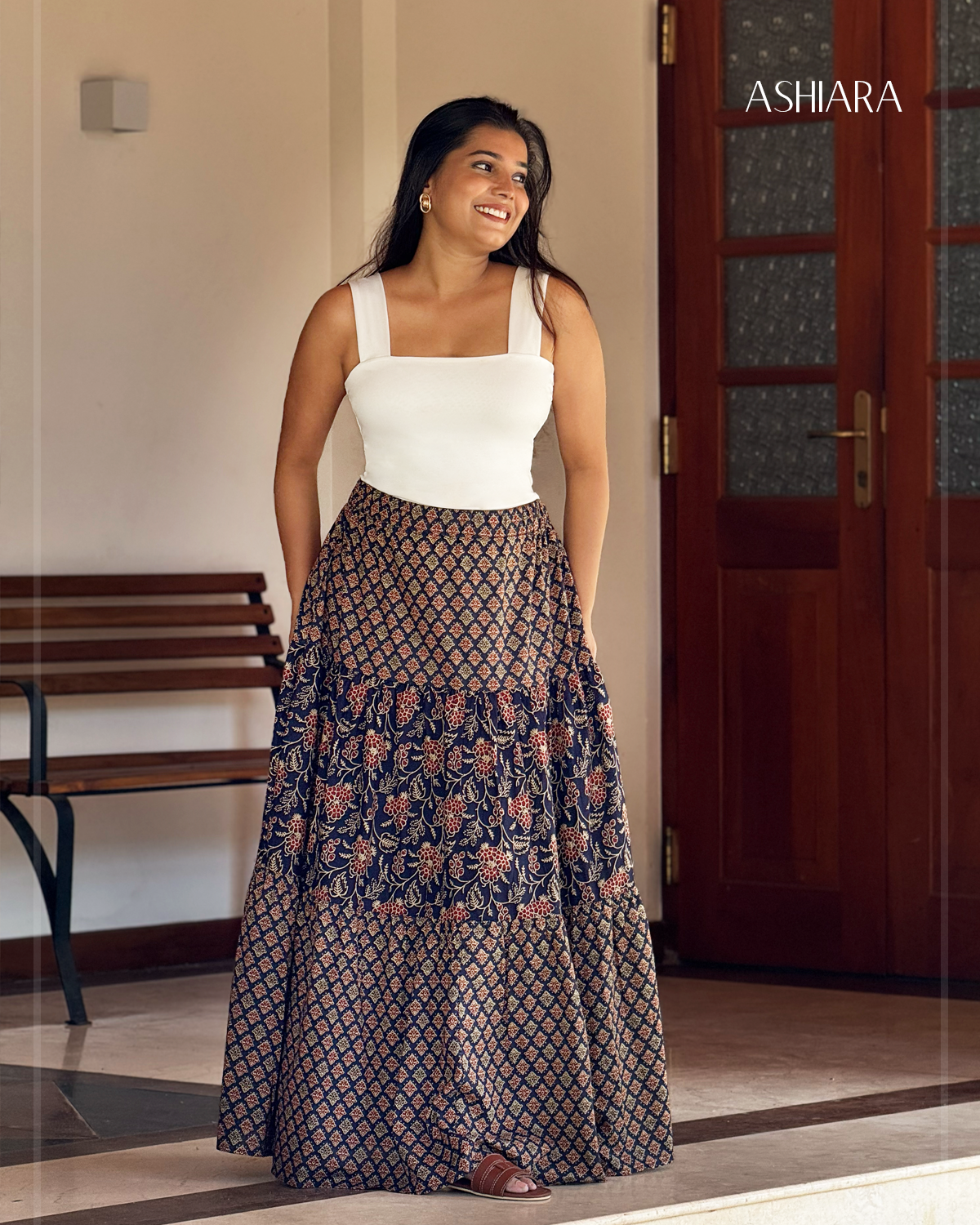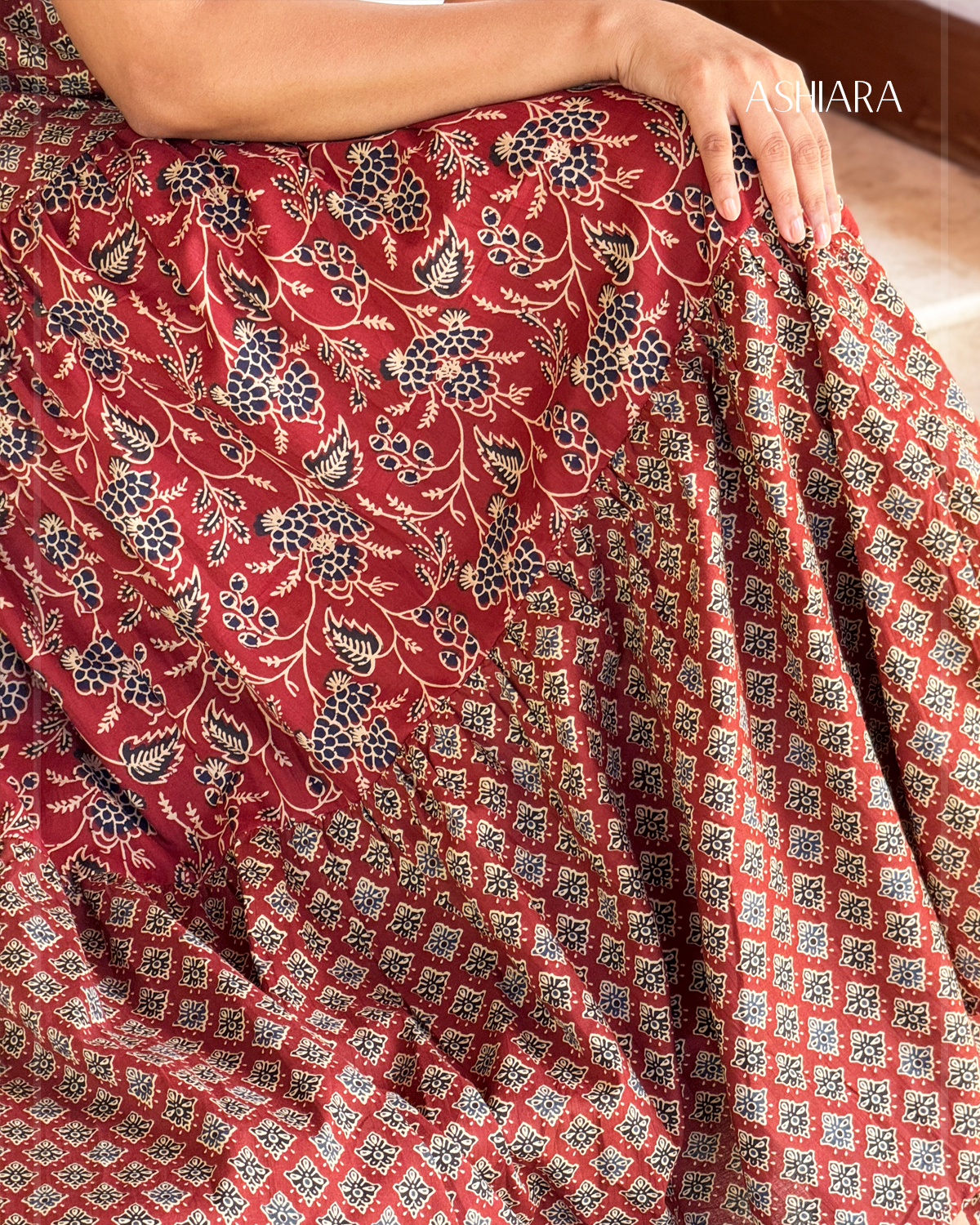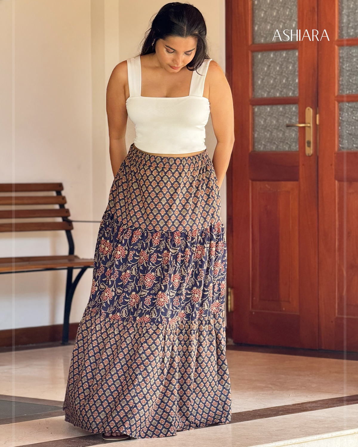 - Three-tier maxi skirt in signature Rajasthan cotton block-print