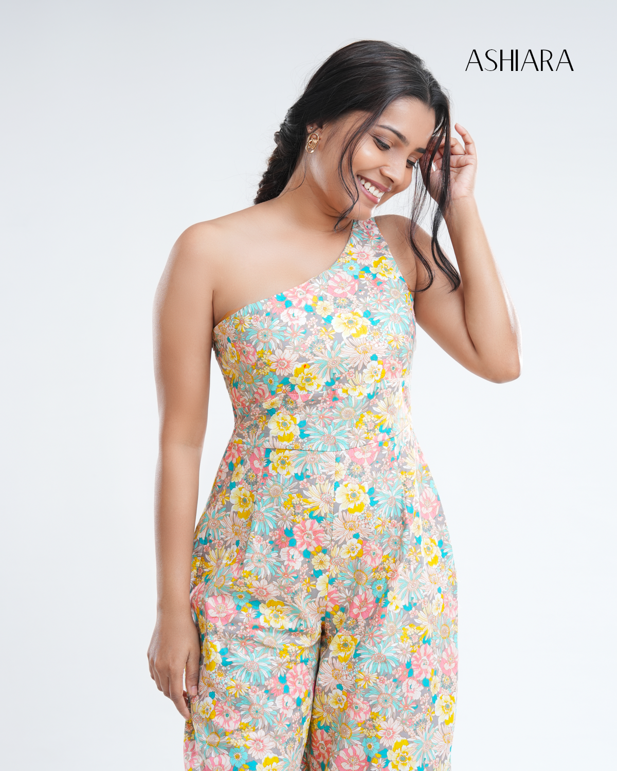 The Serene Jumpsuit in Tropical Bloom features vibrant summer-inspired patterns on soft, premium cotton. Its one-shoulder design is complemented by decorative back straps and a side zipper for easy wear. Ideal for warm-weather events or dressed up for evenings, it offers both style and comfort.