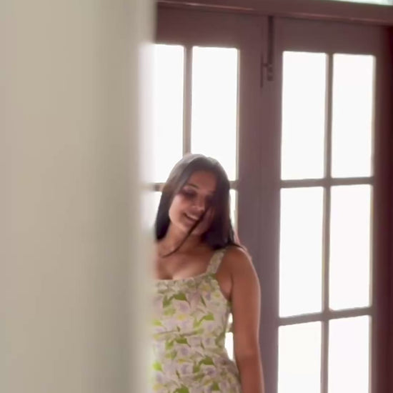 The Sophie Maxi Dress offers a romantic look with its delicate green floral pattern and square neckline. Featuring ruched shoulders and a dropped waistline accented with tulle at the hips, it creates a graceful silhouette inspired by rococo style. A back zipper ensures easy dressing.
