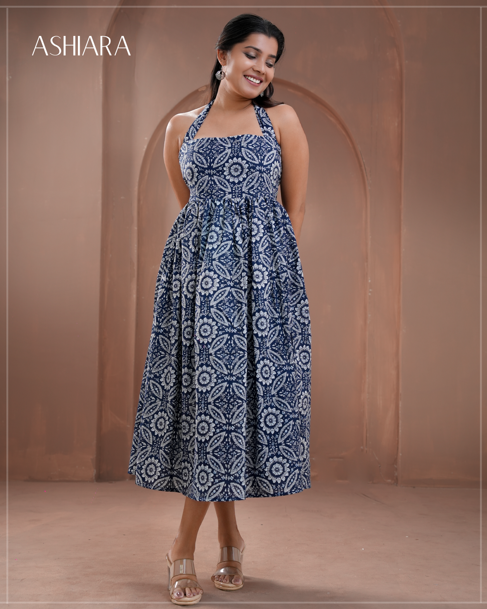 Suhana Midi Dress is crafted from soft Indian cotton and comes with full inner lining for all-day comfort. Designed with a flattering halter neckline and adjustable tie-back straps,Elastic back details- this versatile piece can be styled two ways tie them at the back for a classic halter-neck look or tuck in the straps to wear it as a tube dress. Finished with a beautiful, detailed print and a flowing midi silhouette, Suhana is perfect for warm days, brunches, and relaxed evenings.