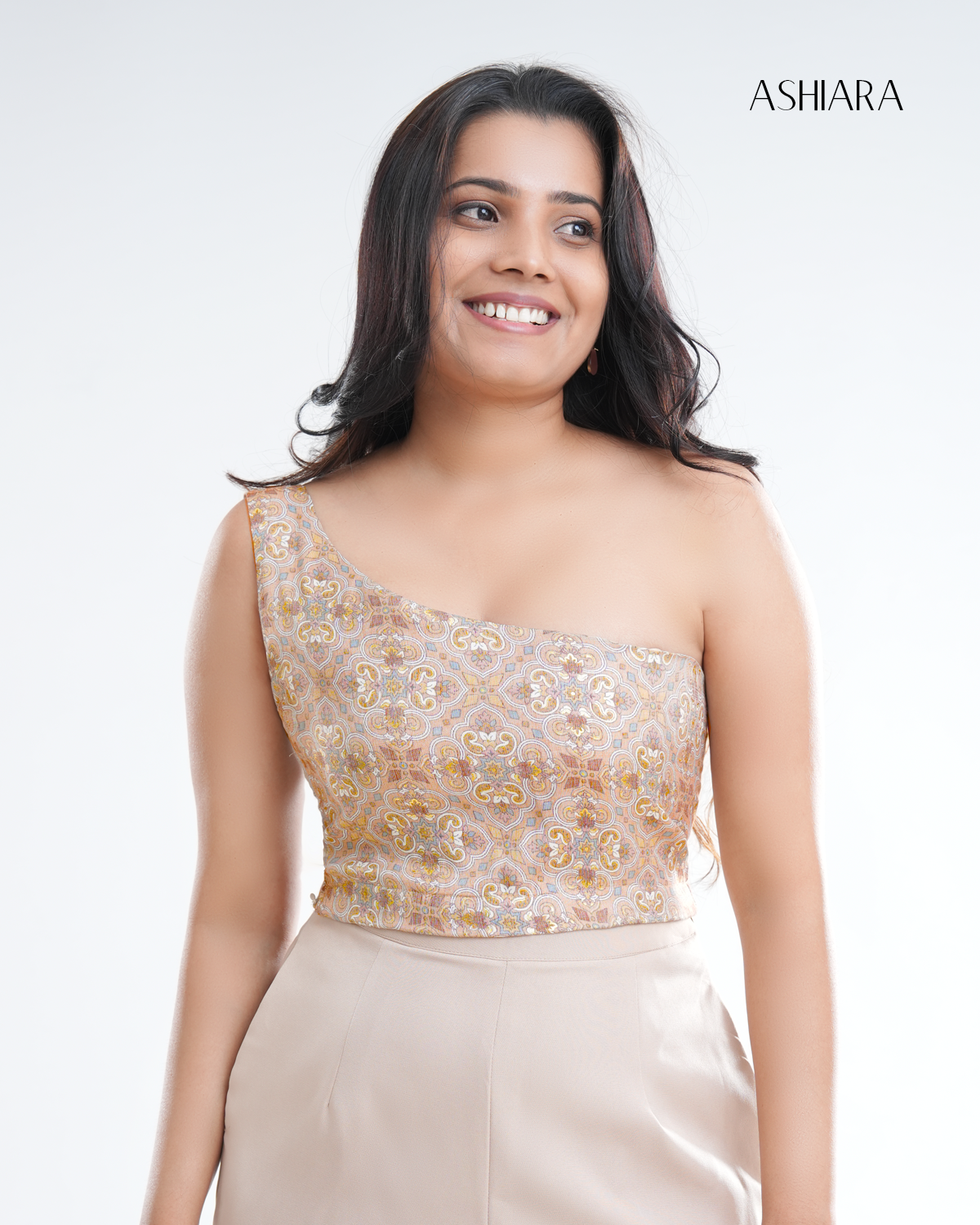 The Tara Top features a striking one-shoulder design with a beautiful Indian print on soft cotton fabric. It includes a hidden side zipper for easy wear and an inner lining for smooth comfort. Perfect to pair with jeans or skirts, this unique top adds a stylish pop of pattern to any outfit.